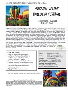 3 Days/4 Meals. Explore the beautiful Hudson Valley as we attend one of the region’s longest running Balloon Festivals. This trip features: Day 1 – lunch at the Historic Hudson River House Inn. Overnight stay at the Hampton Inn and Suites. Day 2 – Moonglow launching, early morning launching, over 75 balloons, vendors, artists, music entertainment and plenty of food at The Balloon Festival. Day 3 – FDR Library and Museum with lunch on own. Cost: $855.00 pp. (Deposit of $100.00 due by May 22, 2026) Registration begins in May.