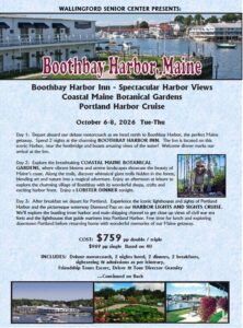 Boothbay Harbor is the perfect Maine Getaway. Spend 2 nights at the charming the Boothbay Harbor Inn located on the Harbor near the footbridge that boasts amazing views of the water!. Explore the breathtaking Coastal Maine Botanical Gardens, where vibrant blooms and serene lanscapes showcase the beauty of Maine’s coast. Lastly experience the Iconic lighthouses and sights of Portland Harbor and the picturesque waterway Diamond Pass on the Harbor Lights and Sights Cruise. Cost: $759.00 pp (Deposit of $250.00 due by July 7, 2026) Registration begins in July.