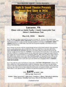 Dinner with an Amish Family, Amish Countryside Tour, Sight and Sound Theater brand new show, Joshua, Kitchen Kettle Village, Hershey Farm Restaurant, Seltzer’s Smokehouse. Cost $699.00 pp. (deposit $150.00) Registration underway.