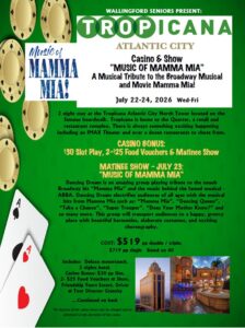 2 night stay at the Tropicana Atlantic City North Tower located on the famous boardwalk. Tropicana is home to the Quarter, a retail and restaurant complex. Casino Bonus- $30 Slot Play, 2-$25 Food Vouchers & Matinee Show. Matinee Show – July 23 “Music of Mamma Mia”. Cost: $519.00 pp (Deposit of $75.00 due by April 22, 2026) Registration underway.